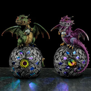Figurine de dragon sur une boule celtique qui s’allume et qui change de couleurs. LED incluses. Pour changer les piles 3X LR44