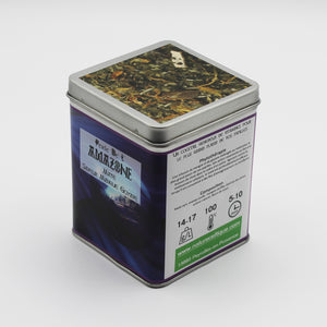 Maté vert, ananas confit, mangue confite, écorces de citron, arôme naturel, et fleurs de souci.