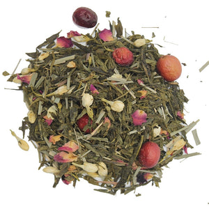 Thé vert, citronnelle, arôme, thé blanc, fleurs de jasmin, pétales de rose, canneberges, feuilles de bambou, et sureau.