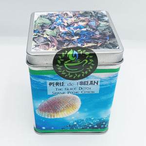 Une boisson Detox rafraîchissante à la couleur de l'océan. A boire chaud ou glacé. L'eau infusée arbore de jolies couleurs bleues.