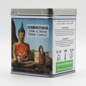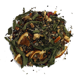 Pomme, feuilles de mûre, bâtons de cannelle, écorces et fèves de cacao, gingembre, verveine, orange, arôme naturel, physalis, fleurs de jasmin, noix, et vanille bourbon.